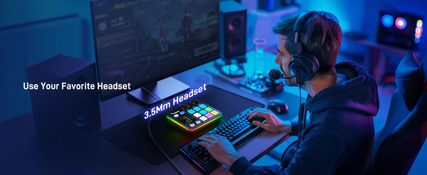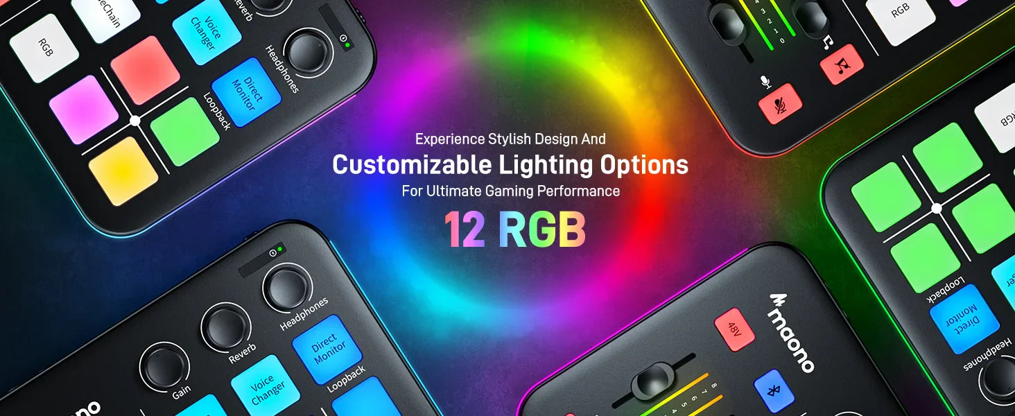 Le Maonocaster G1 Neo Gaming Audio Mixer représente la dernière évolution de la célèbre série Maonocaster. Avec son design lumineux RGB, le G1 Neo offre non seulement des performances audio exceptionnelles, mais ajoute également un élément visuellement attrayant à votre équipement de jeu et de streaming. Son design compact assure une intégration parfaite à votre configuration.