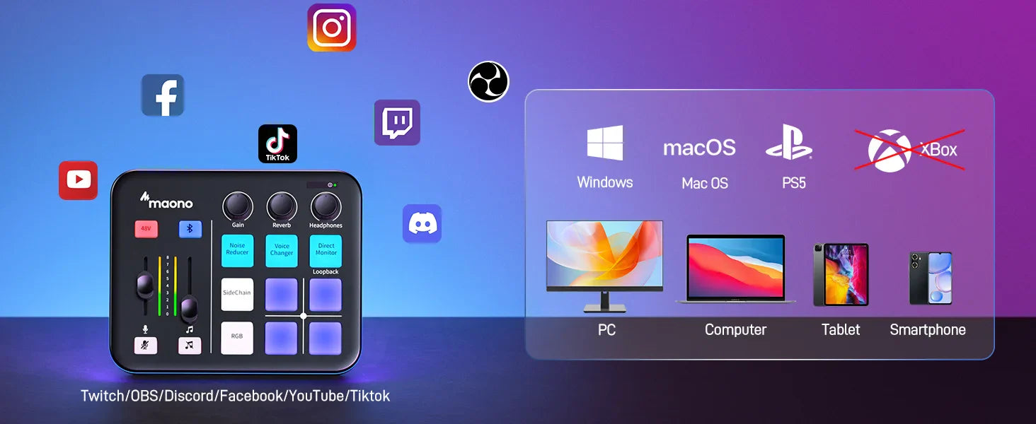 - Compatible avec Windows, macOS, PS5, Android et iOS, et enregistrement facile avec les applications les plus courantes telles que OBS Studio, Discord, Twitch, TikTok, Youtube, Zoom et bien d'autres.