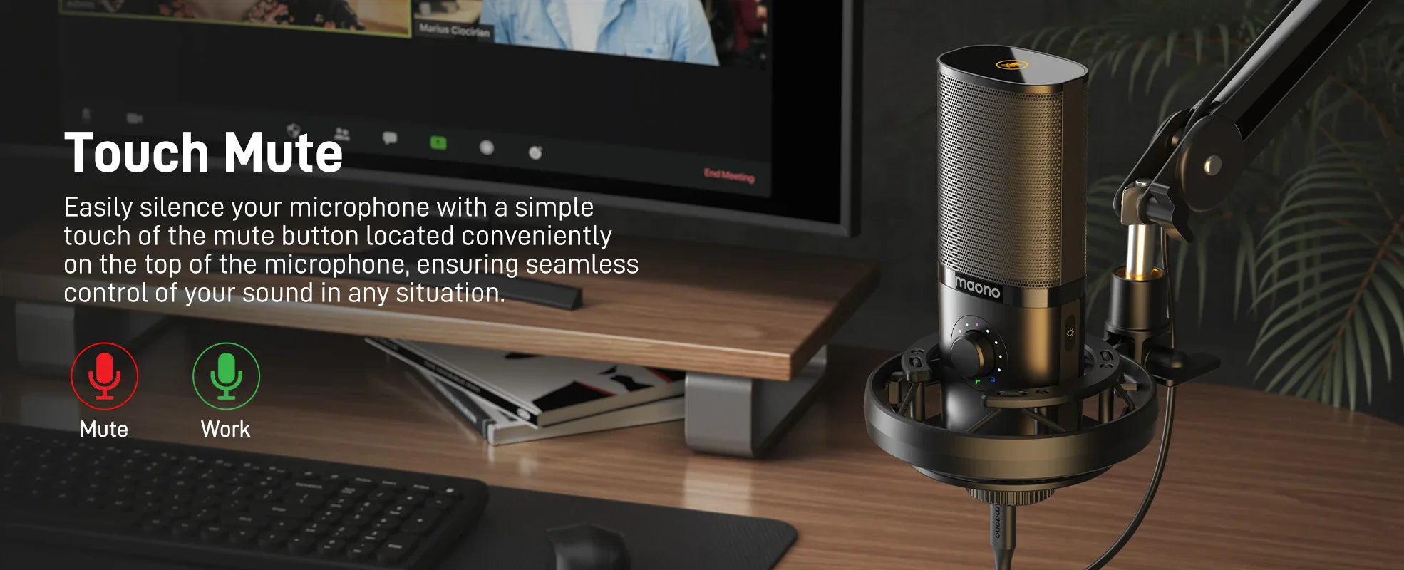 Erhöhen Sie die Kontrolle mit einer Touch-Stummschalttaste und einer LED-Anzeige auf der Oberseite des Mikrofons. Sie bietet eine klare visuelle Rückmeldung, sodass Sie das Mikrofon schnell stummschalten können, um Interaktionen mit dem Publikum oder Pausen zu ermöglichen, ohne versehentliche Audio-Unterbrechungen während Aufnahmen oder Streams.