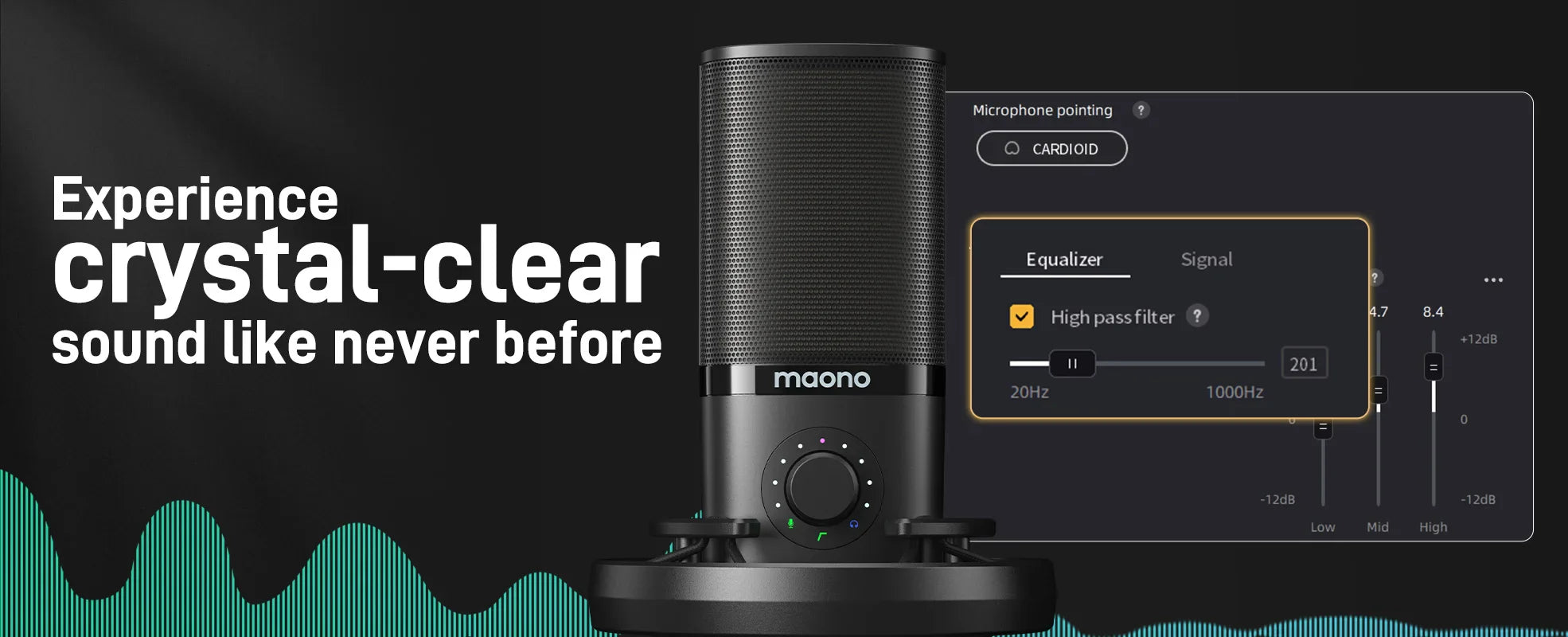 Die Maono Link Software vereinfacht die Klanganpassung: Aktivieren Sie die Rauschunterdrückung, passen Sie den 5-Band-EQ an, optimieren Sie die Mikrofoneinstellungen und bewahren Sie Ihre Voreinstellungen geräteübergreifend mit 11 DSP-Effekten und einer Speicherfunktion. Übernehmen Sie die volle Kontrolle über Ihr Online-Audio mühelos.