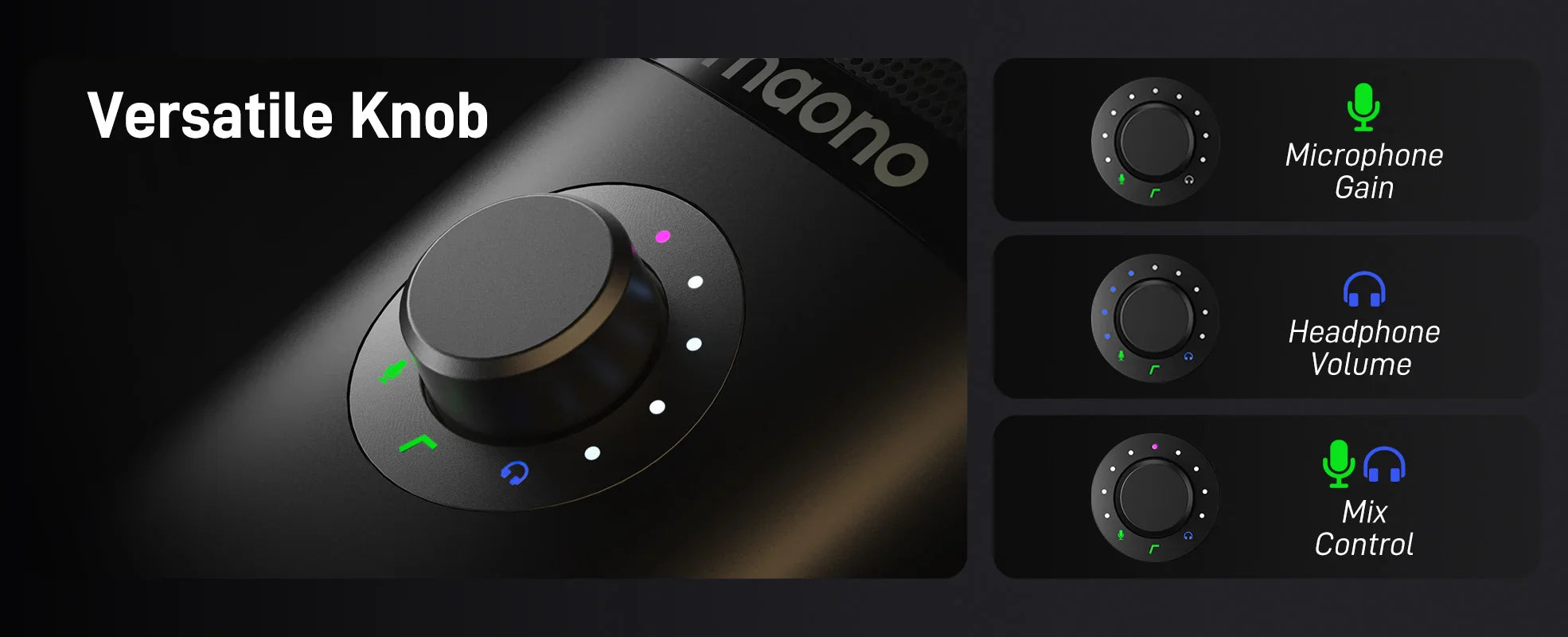 Integriert einen vielseitigen 3-in-1-Einstellknopf für Lautstärke, Gain und Überwachungseffekte, was die Steuerung vereinfacht und die Benutzererfahrung verbessert. Die Echtzeit-Pegelanzeige ermöglicht eine kontinuierliche Überwachung der Aufnahmepegel, um unerwünschte Ploppgeräusche zu verhindern und den Aufnahmeprozess zu optimieren.